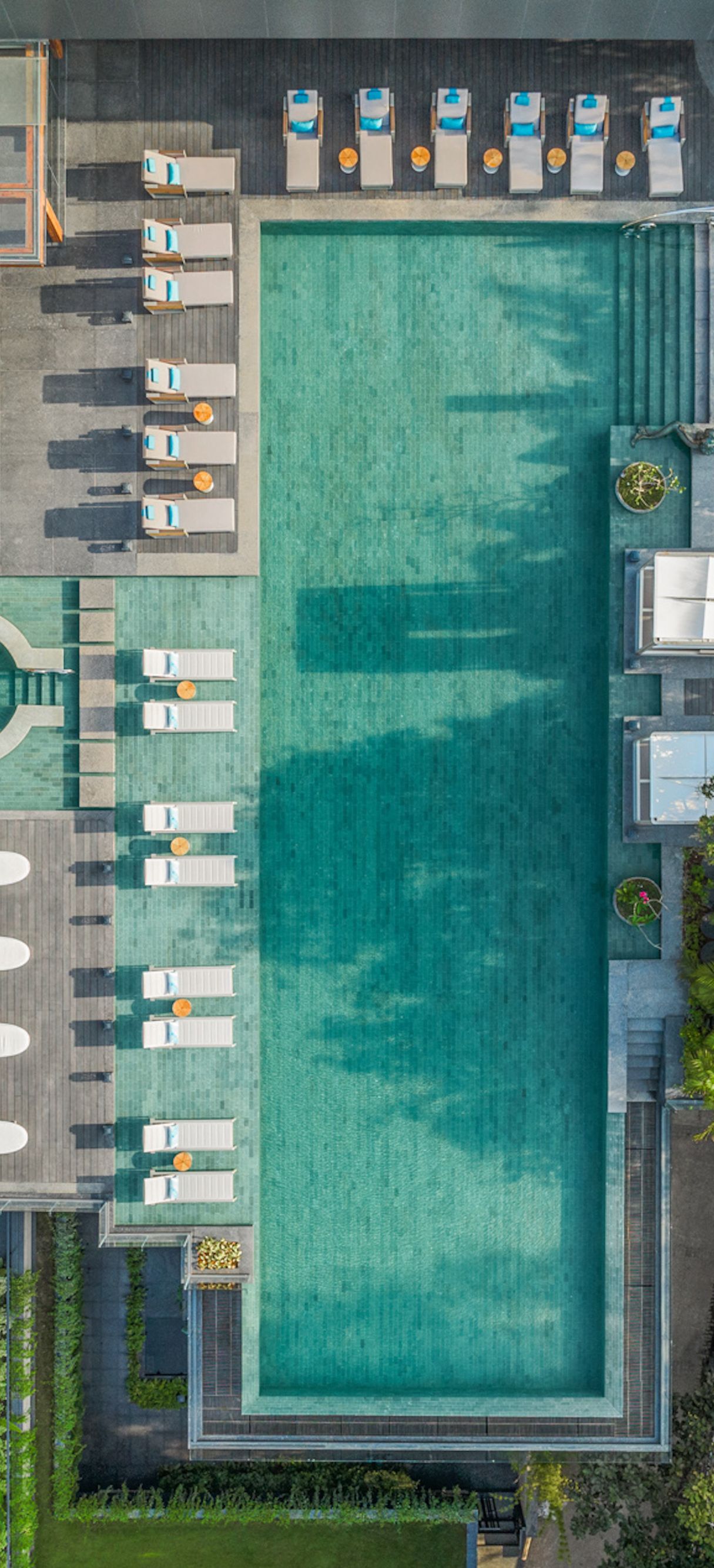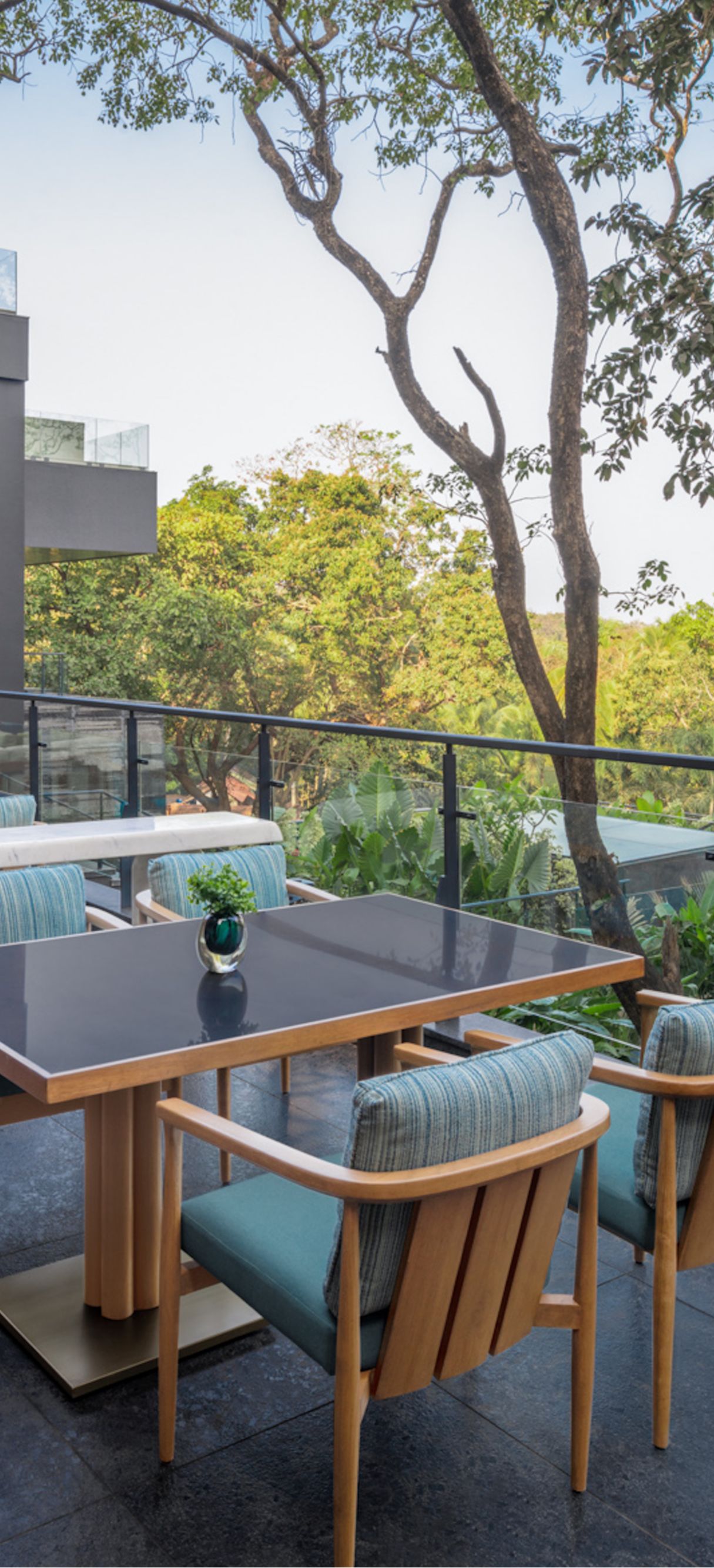 Inspired by the rich culture and traditions of Goa, the 151-room JW Marriott Goa reflects the tranquility and beauty of its surroundings, with an architectural narrative featuring local artifacts such as wooden paneling, mother-of-pearl detailing, intricate glassware chandeliers and water fountains that accentuate the natural marble and stone throughout its serene spaces. The use of neutral color palettes of gray and light sand, along with soft ambient lighting, complements the abundant greenery of its natural surroundings. Goan cultural references and elements of modern design interweave to create a sense of place in a peaceful sanctuary. Guestrooms feature balconies that open to breathtaking ocean views, and luxurious suites offer private plunge pools.