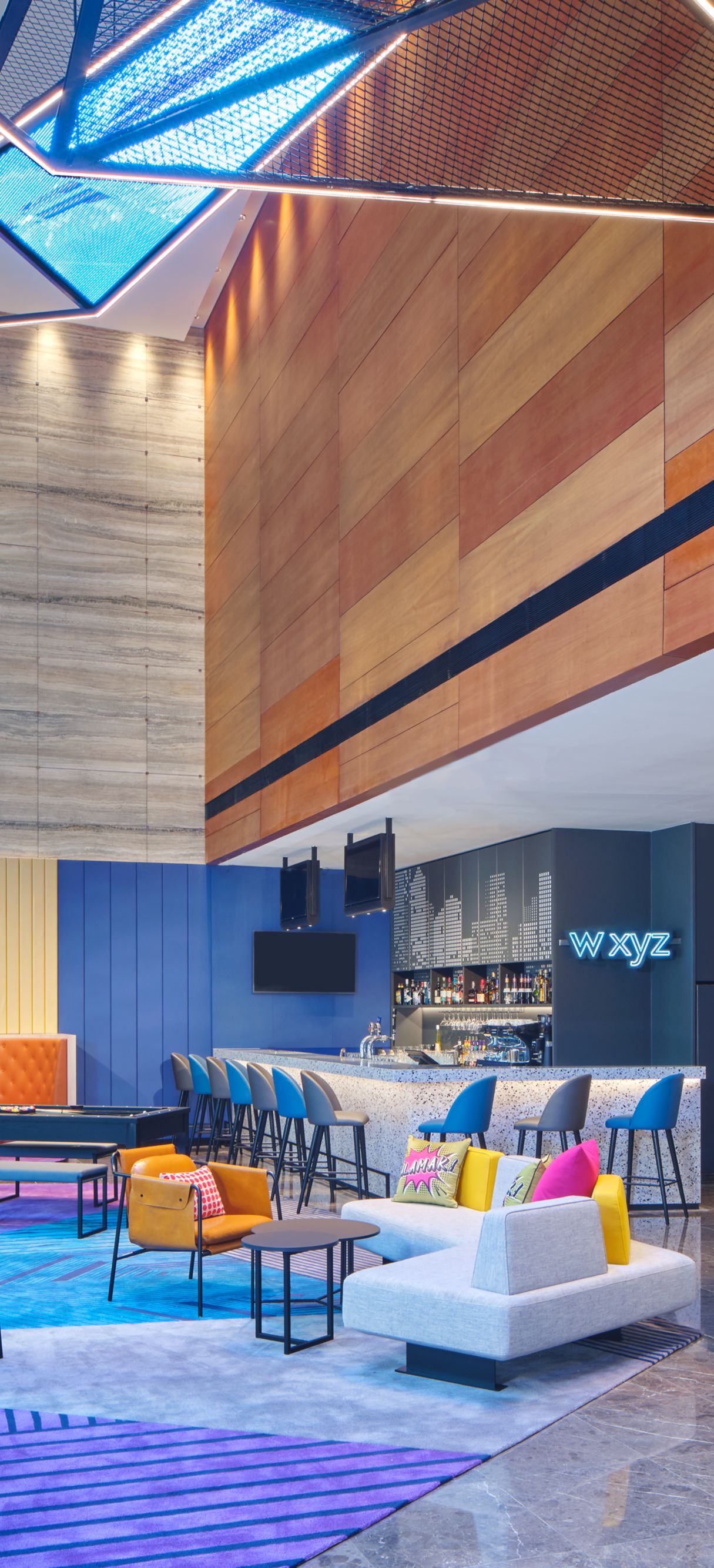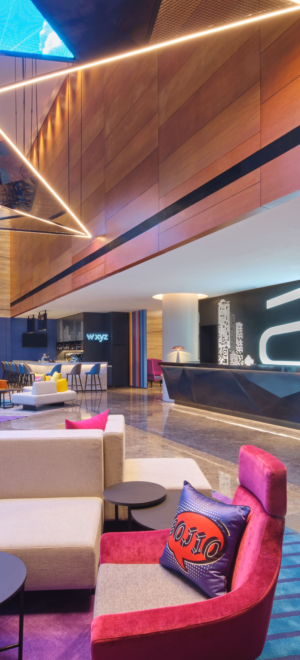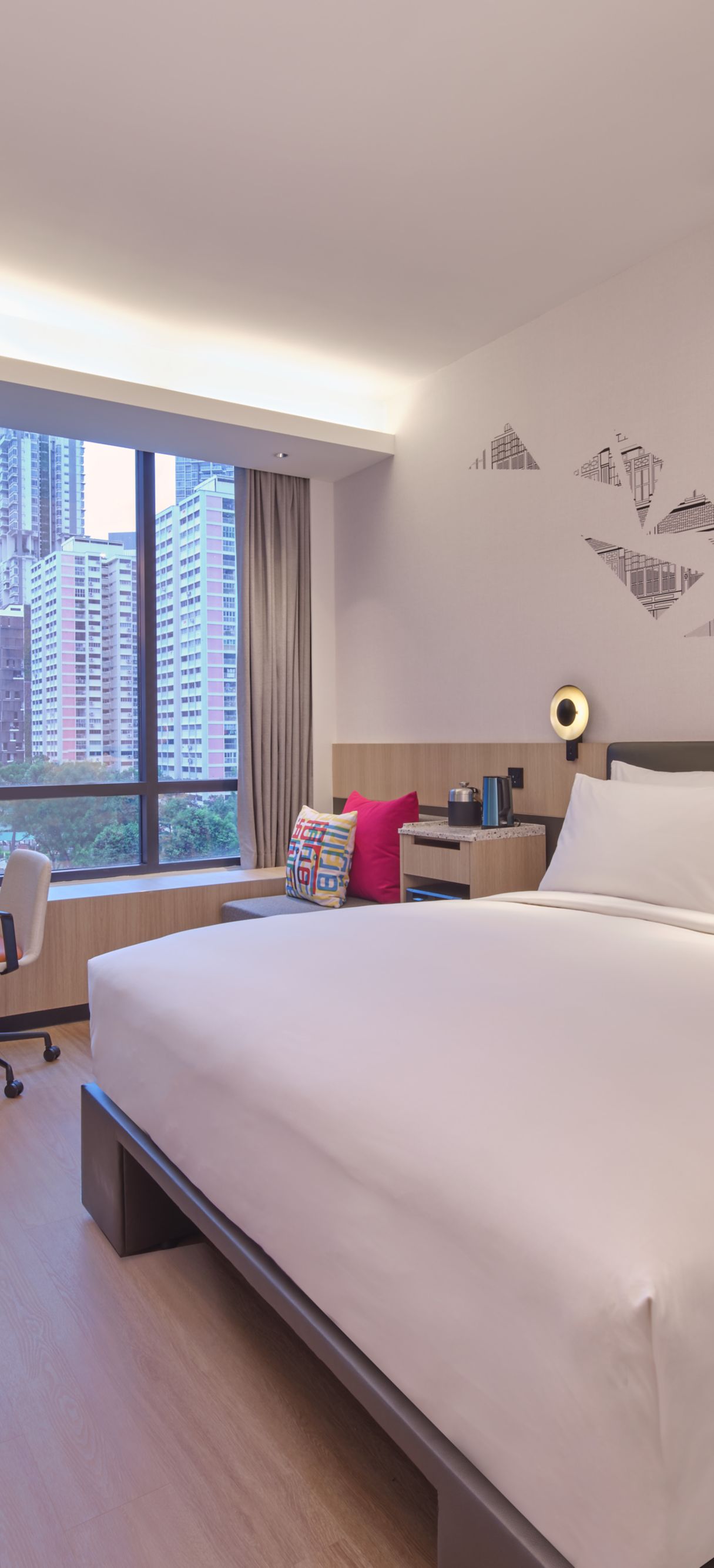 Designed by the award-winning KKS International, Aloft Singapore Novena adopts a “different by design” philosophy that champions personality and passion for music. At the entrance of the hotel stands a magnificent 2.5 meters crescendo sculpture inspired by musical notes. The stunning sculpture is artfully crafted through the interplay of glass and light to emit a spectrum of colours that visually symbolizes the energy and vitality of every guest who steps into the hotel. The hotel lobby boasts an 85” inch video wall, showcasing electronic art from renowned artists like Refik Anadol and Jonathan Monaghan. Another noteworthy feature are the ceiling panels that offer a visually stimulating display of light.