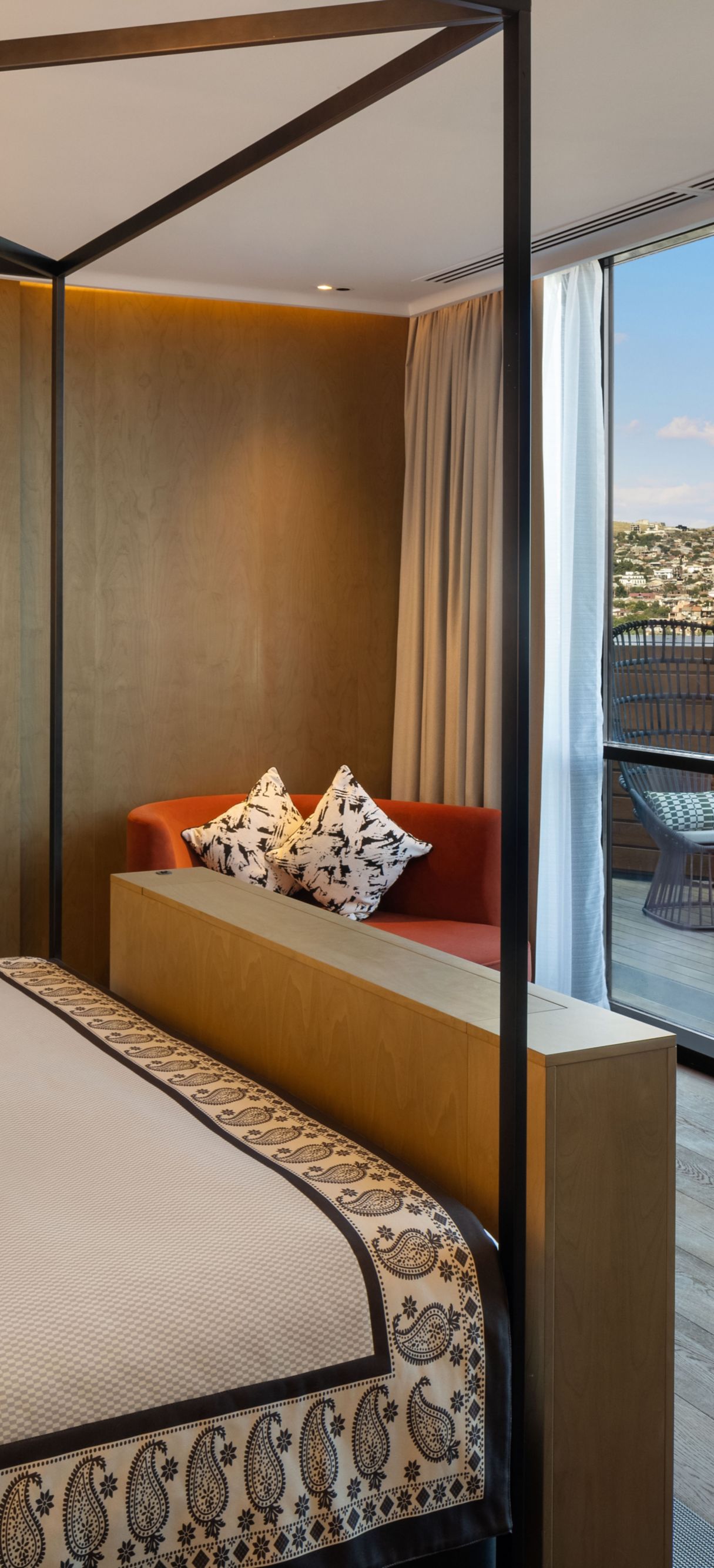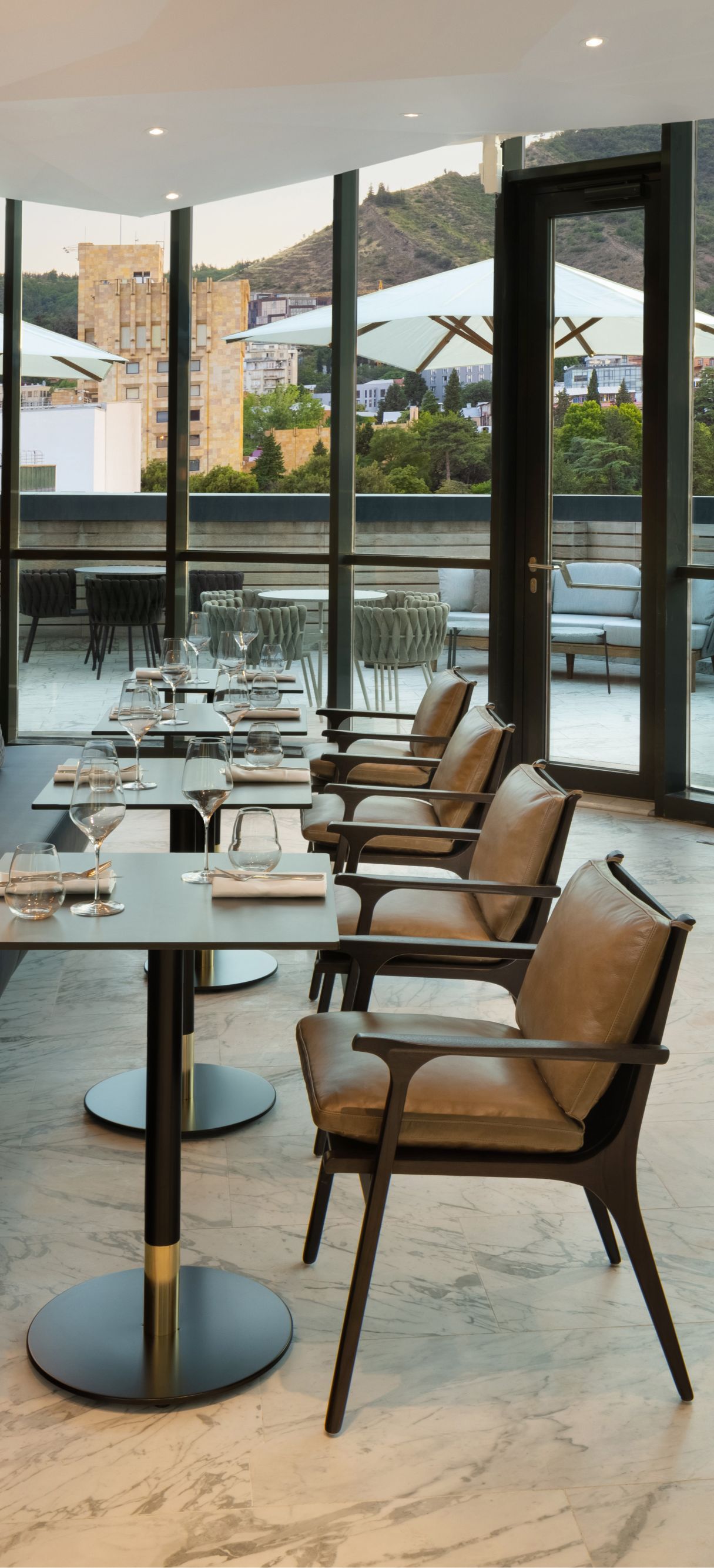The hotel’s interiors, designed by HAT Design Paris, draw inspiration from Georgia’s rich heritage and indigenous history. Design elements are influenced by Chokha, a centuries-old national folk costume known for its triangular shapes and bandoliers, and traditional ornaments with distinctive geometrical patterns. These unique patterns beautifully blend with contemporary aesthetics throughout the hotel’s public spaces and its 220 guestrooms and suites. The guestrooms feature a warm color palette and furnishings crafted from contrasting materials such as leather and velvet, creating a subtle luxurious ambience. Floor-to-ceiling windows illuminate the guestrooms with natural daylight, offering guests an unparalleled view of the historic city. All guestrooms also feature spacious bathrooms with bespoke amenities and wine fridges stocked with a selection of local Georgian wines.