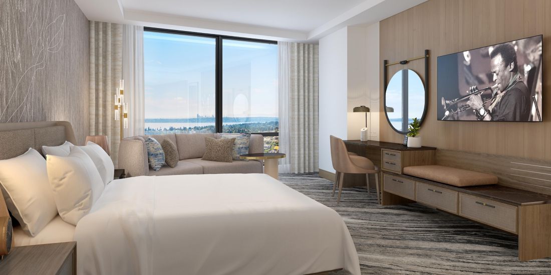 Guests will be captivated by a design inspired by Bellevue’s natural beauty, featuring organic aesthetics and a neutral color palette. The reception area showcases a marble front desk and an abstract mural showcasing Pacific Northwest landscapes. CE LA VI Bellevue, the hotel’s chic cocktail lounge, features a stunning chandelier of hand-blown glass pieces. The 190 guestrooms and 18 suites and family rooms, including a 2,000-square-foot two-bedroom Presidential Suite, offer expansive views and sophisticated touches with high-quality finishes.